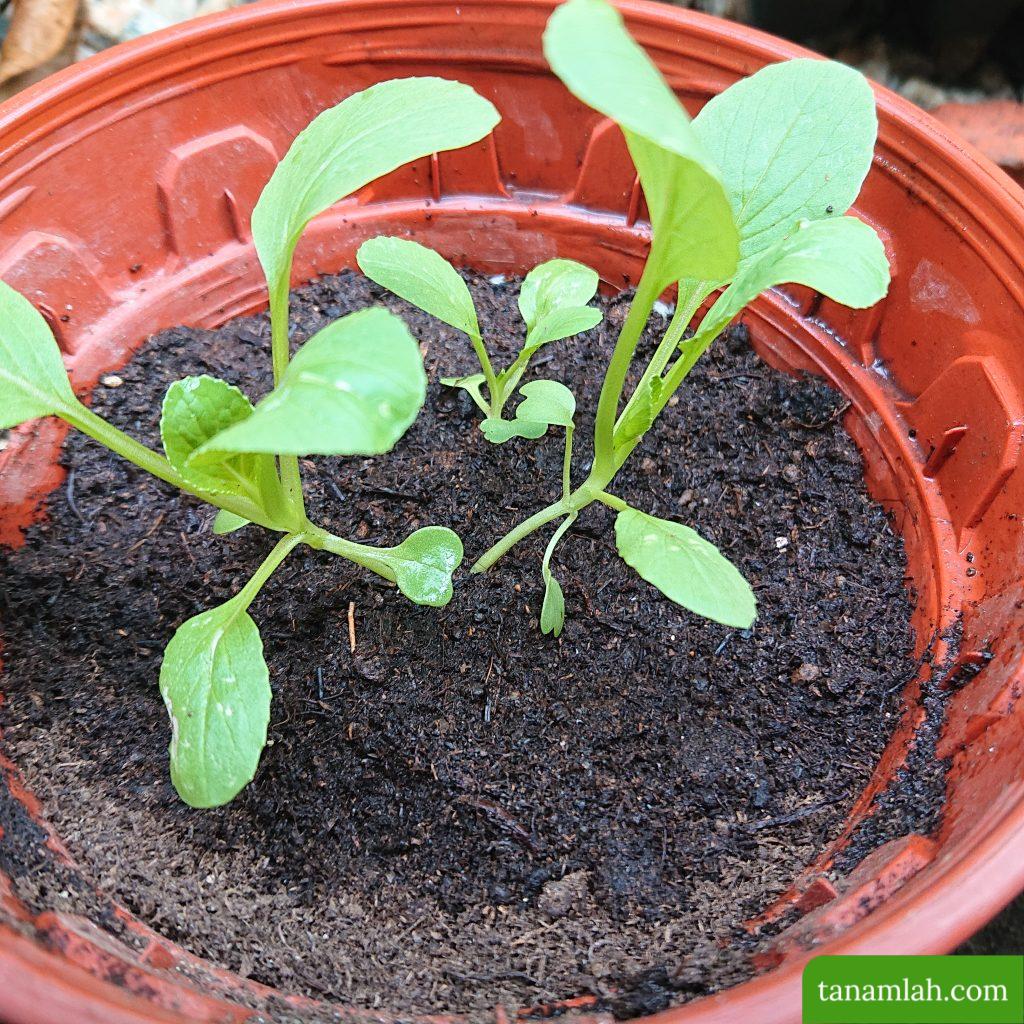 Untuk sawi jenis sederhana/besar, selepas dalam seminggu dua, selalunya dah boleh nampak satu anak benih yang paling kuat. Kita kena kejam sikit dan buang yang dah “kalah” (kecil, terbantut, tumbang, dan sebagainya).